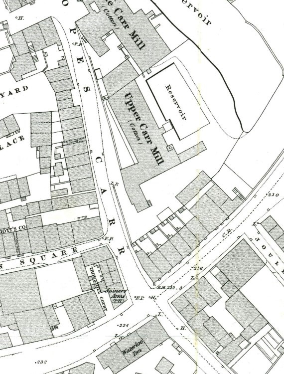The map is from 1873 and shows the lower part of Hopes Carr, Stockport. The 1851 census lists houses numbered from 1 to 23 (from 2 to 24 in the 1871 census), which were on the west side of the street. William Wilkinson lived at 1 Hopes Carr before marriage and at 13 afterwards. The photograph is from the early years of the 20th century and is a south-westerly view of Hopes Carr, as seen from Orchard Street. (Photograph: acknowledgement to Stockport Metropolitan Borough Council Image Archive.10)