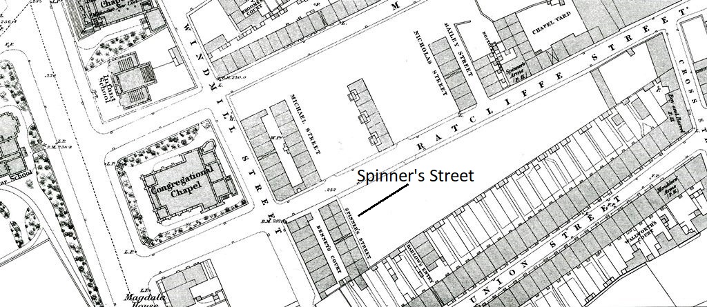 This is an extract from an Ordnance Survey map which was surveyed in 1849 and revised in 1873. At that point, only one side of Spinner's Street had been built. All the open areas, as seen on the map, would eventually disappear as more buildings were crammed into whatever space was available. Spinner's Street no longer exists, but there is a modern Spinner (not Spinner's) Street, about half a mile to the north east of its earlier version.