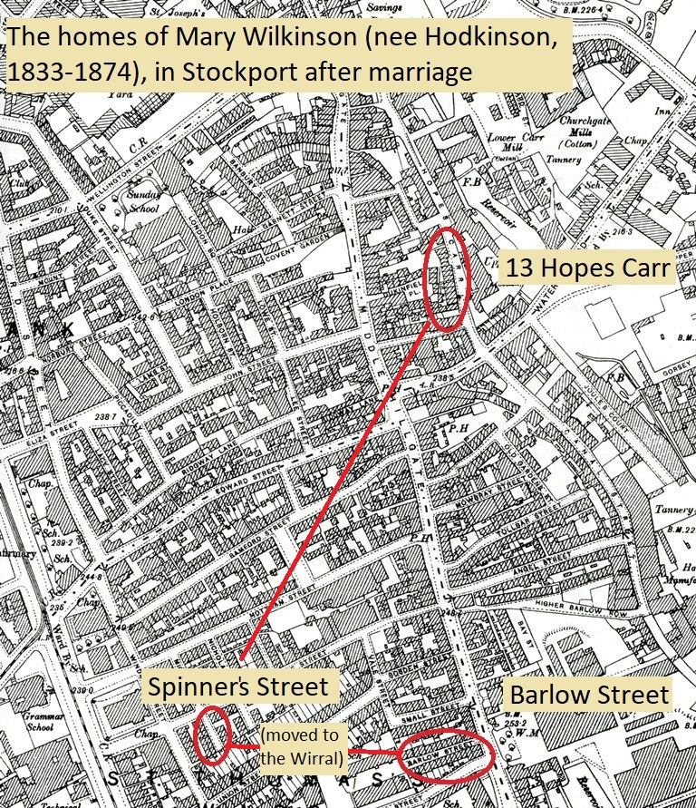 This map shows the location of the Wilkinsons' homes in Stockport. The family lived in Hope's Carr and Spinner's Street before moving to the Wirral and then back to Stockport, to Barlow Street, where Mary died.