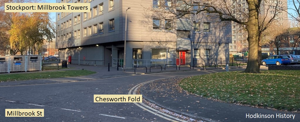 What happened to Spinner's Street? The middle of the street ran, in very approximate terms, from the red fire sign on the front of Mottram Towers, underneath the tower and across Chesworth Fold to the small wall seen on the right of the image. (Photograph: Samuel Hodkinson.)