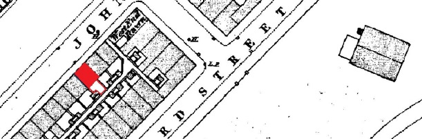 The home of Eliza Ellen Hodkinson on John Street, Ashton-under-Lyne, is marked in red. See the map a short distance further up this page which shows John Street in a wider context.