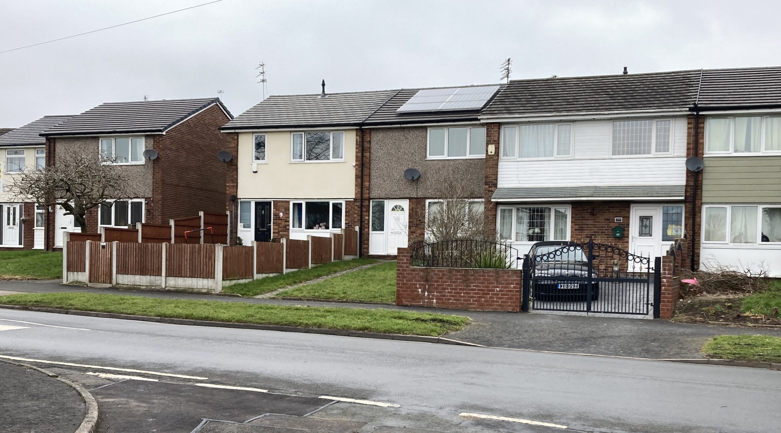 In the image above, 78 Micklehurst Green, Offerton, Stockport, is the house with solar panels. The houses along here have their front doors on Alfreton Road, but, strangely, have their addresses as Micklehurst Green which is where the backs of the houses are. Maybe they were built the wrong way round?! (Photograph: Samuel Hodkinson.)
