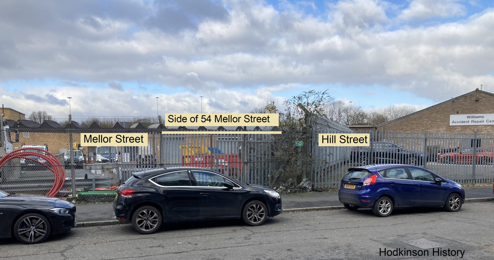 54 Mellor Street is the end house on the right, near the concrete bollard in the black and white photograph taken in about 1965. The colour photograph shows the location of the south side of the house, which ran more or less along the line of the grey fencing. (Black and white image: acknowledgement to Stockport Metropolitan Borough Council Image Archive4. Colour image: Samuel Hodkinson.)
