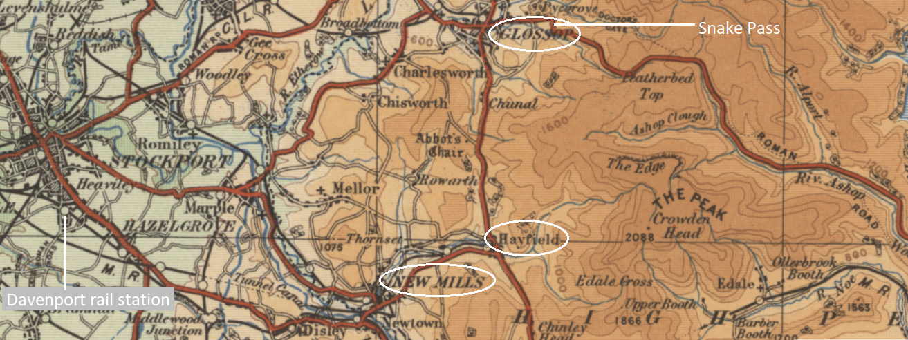 An example of a Hodkinson ramble ... on Easter Monday 1927, Jack Hodkinson and his brother went for a 24-mile ramble. They took the train from Davenport station to New Mills, walked to Hayfield, then continued north to Glossop and the Snake Pass, followed by, at some point, a cross-country hike back to Hayfield, finishing with an easier walk to New Mills and a welcome train home. The map was published in 1934.