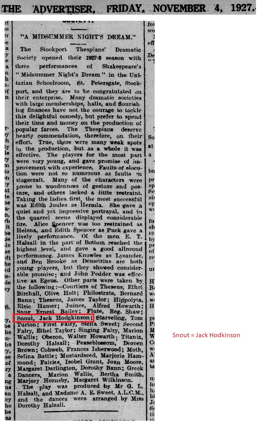 Jack Hodkinson enjoyed acting and was a member of the Stockport Thespians' Dramatic Society. In April 1927, his brother wrote a diary entry about going to a performance of Dicken’s Bleak House by the Thespians, “in which our Jack has a part.” Another entry, made on 17th October 1927, mentions a visit to see A Midsummer Night’s Dream. In this play, Jack played the character Snout, who has eight lines in the play, with a further two lines as Wall. In January 1928, Jack played another minor role – that of Sampson Brass – in Dickens' The Old Curiosity Shop.