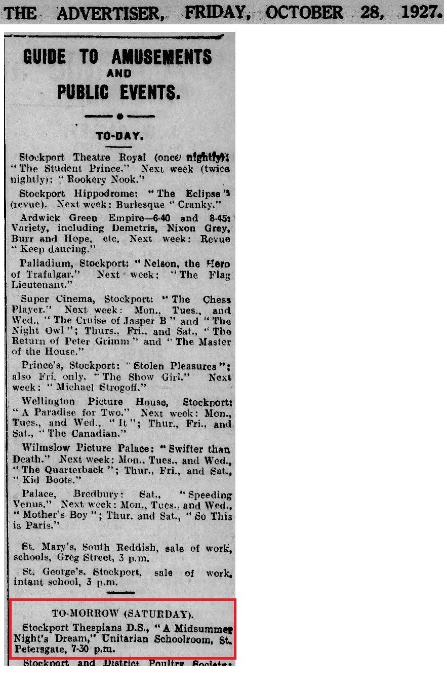 Clicking on the newspaper images above provides larger versions. The two local newspapers – the Stockport Borough Express (known as the Express) and the Stockport Guardian and Advertiser (the Advertiser) – reported weekly on local drama productions. However, the Advertiser gave reviews that were more in-depth and critical than those of the Express. The Advertiser also often published cast lists and in the above extracts, Jack Hodkinson gains a “g” in his surname.